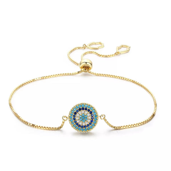 This cute bracelet for women shows an Evil Eye charm with blue Cubic Zirconia stones. It's small, dainty and not showy, it can be worn alone or stacked with something else. The perfect gift for you or a loved one! An elegant gift for her.