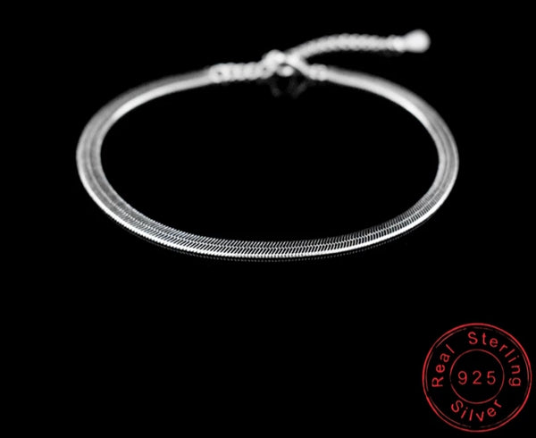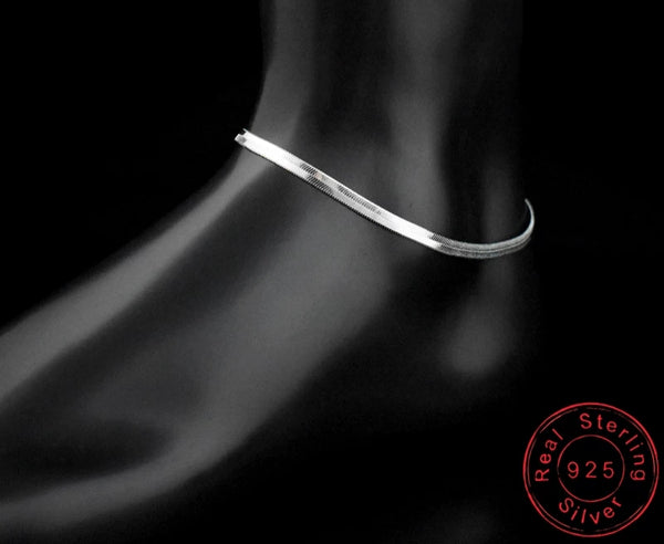 It a beautiful Sterling Silver 3 mm thick Snake type anklet with Pear Shape lobster claw clasp. This anklet is 15 grams, sits nicely.