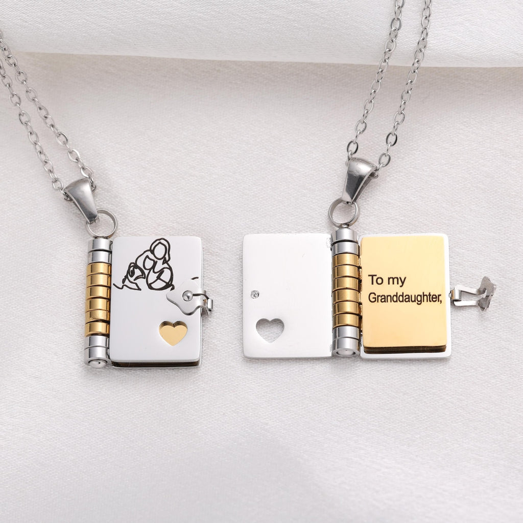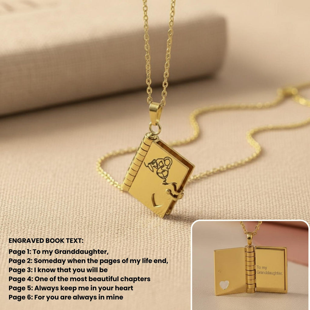 Create a story they can wear forever. Our Custom Book Necklace features a beautifully crafted mini book pendant with pre-written scripts for your granddaughter. Each book opens to reveal meaningful messages designed to inspire, comfort, and remind them of your love.