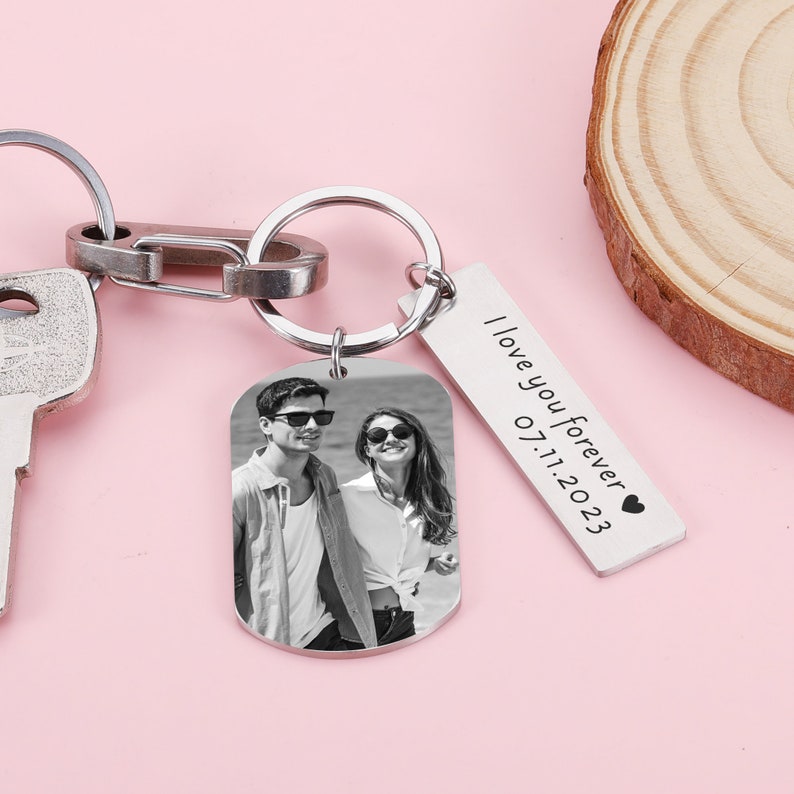 Personalized photo keychain with custom date & message. A perfect keepsake gift for anniversaries, birthdays, weddings & everyday memories. Durable & stylish.